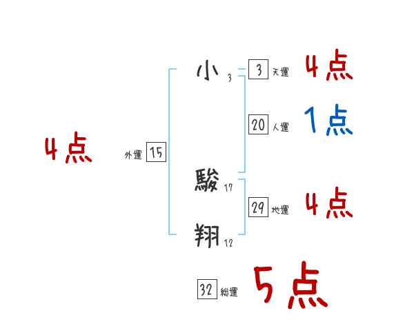 天運![]() | 小駿翔さんの天運は3画の4つ星!活動的で才能に恵まれ、多くの信頼を得る。希望に満ち成長する。 家系が持つ宿命的な運勢を表します。祖先から受け継いだ苗字ですので自分の力が及びません。家柄を象徴します。 |