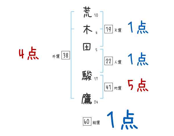 天運![]() | 荒木田駿鷹さんの天運は19画の1つ星!優れた才能を持ちますが、協調性が足りないことも。周りの人と協力する事を意識しましょう。 家系が持つ宿命的な運勢を表します。祖先から受け継いだ苗字ですので自分の力が及びません。家柄を象徴します。 |