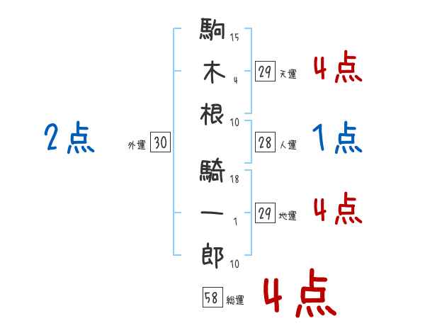総運![]() | 駒木根騎一郎さんの総運は58画の4つ星!安定した生活。大器晩成タイプ。 あなたの人生を表す1番重要な運勢です。生涯を通じて影響する総合運となり、主に50歳以降の晩年期に影響を及ぼします。 |