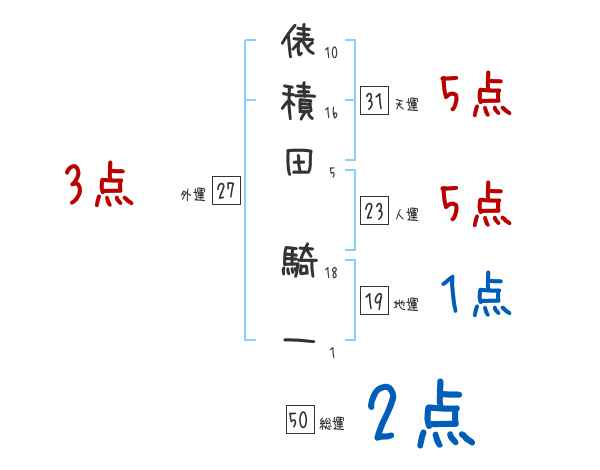 外運![]() | 俵積田騎一さんの外運は27画の3つ星!頭脳明晰だが強情で摩擦が多い傾向。孤立に注意。 生活面を象徴する運勢です。外部から受ける影響力を表し、結婚運、家庭運や職場、環境への順応性を表します。 |