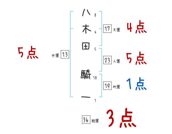 人運![]() | 八木田騎一さんの人運は23画の5つ星!想像力に優れ活力がある。一代で成功し名誉を手に入れる。 性格や才能などを表す2番目に重要な運勢です。人間関係や協調性、社会的な成功に影響します。主に20歳から50歳ぐらいまでの中年期の運勢を表します。 |