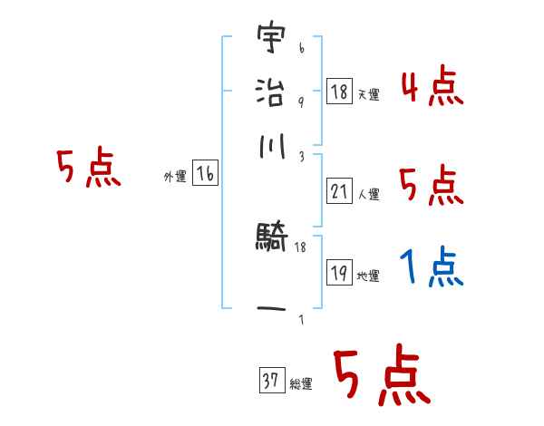 天運![]() | 宇治川騎一さんの天運は18画の4つ星!情熱的で剛気。忍耐力があり信頼される。 家系が持つ宿命的な運勢を表します。祖先から受け継いだ苗字ですので自分の力が及びません。家柄を象徴します。 |
