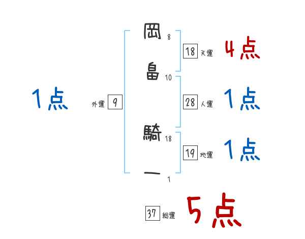 人運![]() | 岡畠騎一さんの人運は28画の1つ星!家庭環境に注意。スポーツで活躍できる能力があるかも。 性格や才能などを表す2番目に重要な運勢です。人間関係や協調性、社会的な成功に影響します。主に20歳から50歳ぐらいまでの中年期の運勢を表します。 |