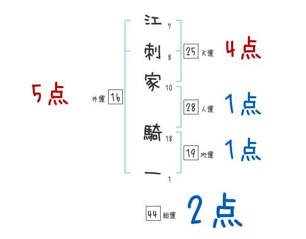 外運![]() | 江刺家騎一さんの外運は16画の5つ星!人望が厚く大きく発展する。逆転成功が見える。 生活面を象徴する運勢です。外部から受ける影響力を表し、結婚運、家庭運や職場、環境への順応性を表します。 |