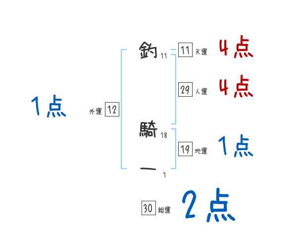 天運![]() | 釣騎一さんの天運は11画の4つ星!着実に富や地位を得る幸運な人生。 家系が持つ宿命的な運勢を表します。祖先から受け継いだ苗字ですので自分の力が及びません。家柄を象徴します。 |