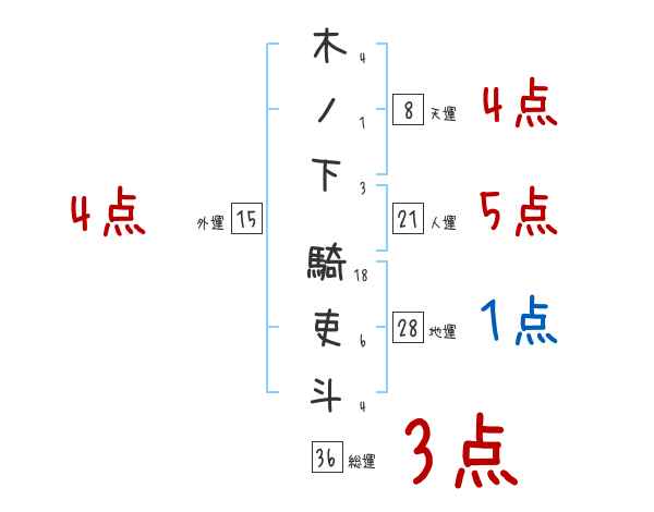 天運![]() | 木ノ下騎吏斗さんの天運は8画の4つ星!勤勉家。根気強く努力し成功する。忍耐力がある。 家系が持つ宿命的な運勢を表します。祖先から受け継いだ苗字ですので自分の力が及びません。家柄を象徴します。 |