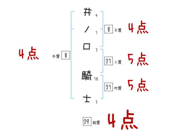 天運![]() | 井ノ口騎士さんの天運は8画の4つ星!勤勉家。根気強く努力し成功する。忍耐力がある。 家系が持つ宿命的な運勢を表します。祖先から受け継いだ苗字ですので自分の力が及びません。家柄を象徴します。 |