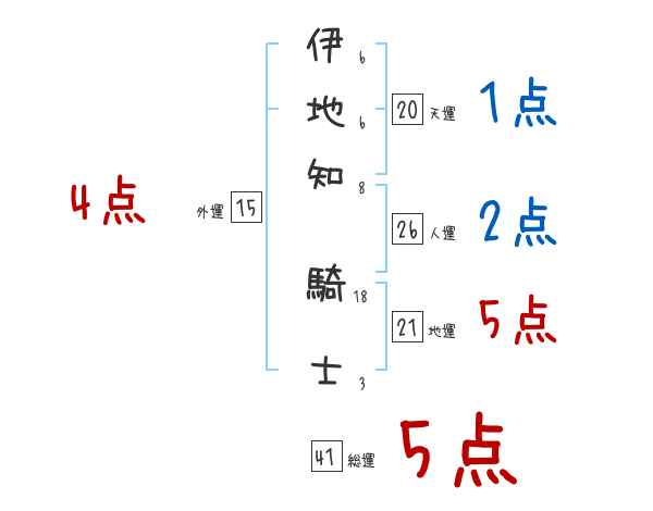 外運![]() | 伊地知騎士さんの外運は15画の4つ星!人徳があり出世する。順調に物事を進め円満な人生。 生活面を象徴する運勢です。外部から受ける影響力を表し、結婚運、家庭運や職場、環境への順応性を表します。 |