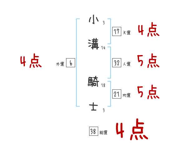 総運![]() | 小溝騎士さんの総運は38画の4つ星!温厚な性格で技術的な才能を発揮する。職人的な仕事に向いている。 あなたの人生を表す1番重要な運勢です。生涯を通じて影響する総合運となり、主に50歳以降の晩年期に影響を及ぼします。 |