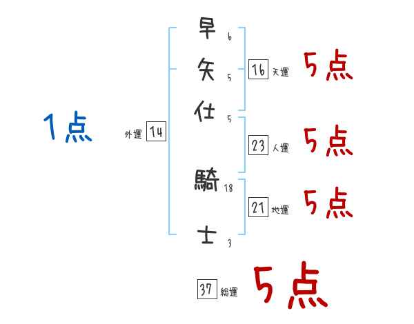 天運![]() | 早矢仕騎士さんの天運は16画の5つ星!人望が厚く大きく発展する。逆転成功が見える。 家系が持つ宿命的な運勢を表します。祖先から受け継いだ苗字ですので自分の力が及びません。家柄を象徴します。 |