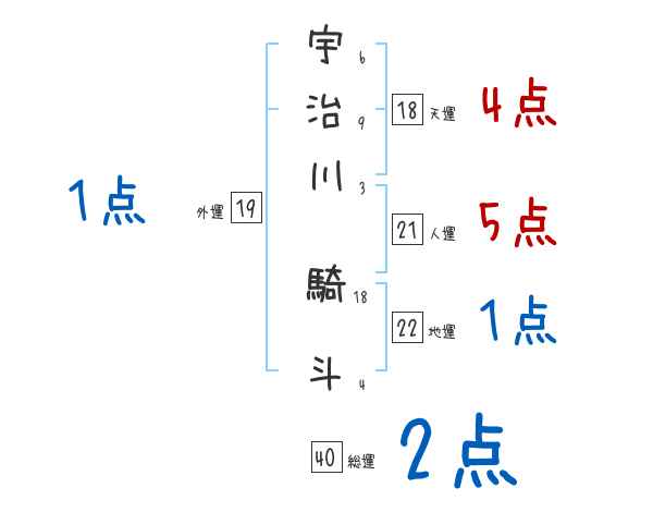 天運![]() | 宇治川騎斗さんの天運は18画の4つ星!情熱的で剛気。忍耐力があり信頼される。 家系が持つ宿命的な運勢を表します。祖先から受け継いだ苗字ですので自分の力が及びません。家柄を象徴します。 |