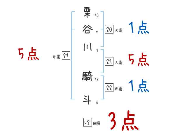 外運![]() | 栗谷川騎斗さんの外運は21画の5つ星!統率力がある。独立し成功する。名誉を手に入れる。 生活面を象徴する運勢です。外部から受ける影響力を表し、結婚運、家庭運や職場、環境への順応性を表します。 |