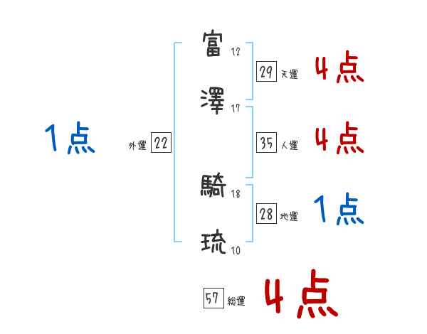 天運![]() | 富澤騎琉さんの天運は29画の4つ星!完全主義で才能がある。厳格な心の持ち主。 家系が持つ宿命的な運勢を表します。祖先から受け継いだ苗字ですので自分の力が及びません。家柄を象徴します。 |