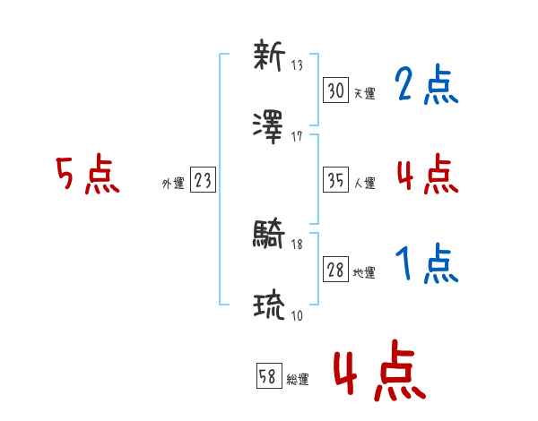 天運![]() | 新澤騎琉さんの天運は30画の2つ星!浮き沈みの激しさに注意しましょう。 家系が持つ宿命的な運勢を表します。祖先から受け継いだ苗字ですので自分の力が及びません。家柄を象徴します。 |
