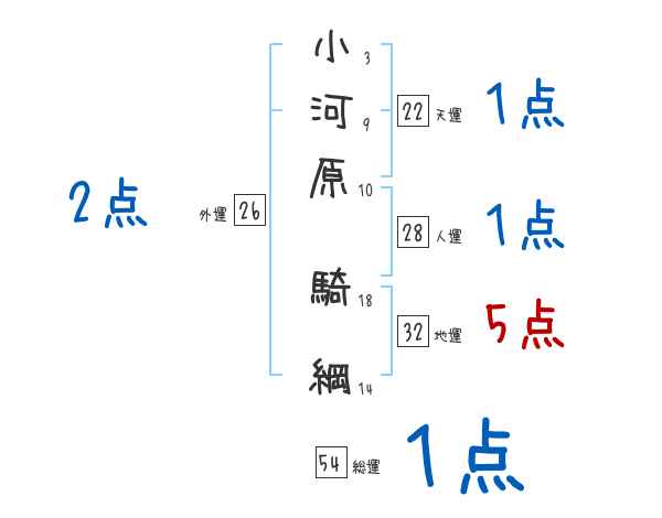 外運![]() | 小河原騎綱さんの外運は26画の2つ星!波瀾万丈かも。信頼できる人を大事にしましょう。 生活面を象徴する運勢です。外部から受ける影響力を表し、結婚運、家庭運や職場、環境への順応性を表します。 |