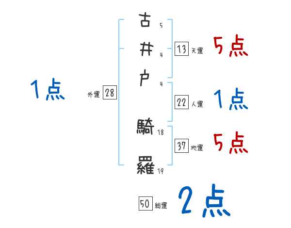 天運![]() | 古井戸騎羅さんの天運は13画の5つ星!才能に恵まれ人気がある。名声を手に入れる。円満な人生。 家系が持つ宿命的な運勢を表します。祖先から受け継いだ苗字ですので自分の力が及びません。家柄を象徴します。 |