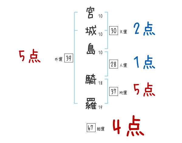 外運![]() | 宮城島騎羅さんの外運は39画の5つ星!社交性に優れ人望が厚い。人の上に立ち成功する。 生活面を象徴する運勢です。外部から受ける影響力を表し、結婚運、家庭運や職場、環境への順応性を表します。 |