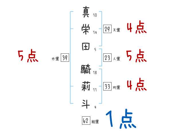 外運![]() | 真栄田騎莉斗さんの外運は39画の5つ星!社交性に優れ人望が厚い。人の上に立ち成功する。 生活面を象徴する運勢です。外部から受ける影響力を表し、結婚運、家庭運や職場、環境への順応性を表します。 |