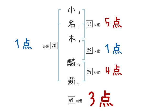 総運![]() | 小名木騎莉さんの総運は42画の3つ星!病気に注意。多芸であるが消極的でおとなしい。 あなたの人生を表す1番重要な運勢です。生涯を通じて影響する総合運となり、主に50歳以降の晩年期に影響を及ぼします。 |