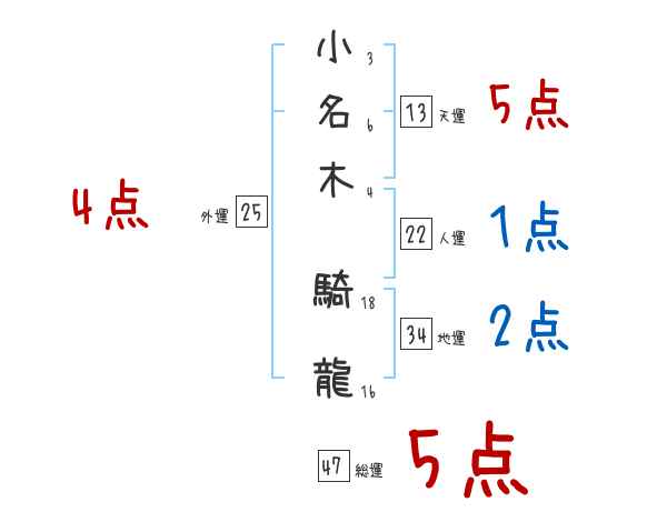 総運![]() | 小名木騎龍さんの総運は47画の5つ星!実力が開花し発展する円満な人生。財に恵まれる。 あなたの人生を表す1番重要な運勢です。生涯を通じて影響する総合運となり、主に50歳以降の晩年期に影響を及ぼします。 |