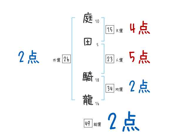 外運![]() | 庭田騎龍さんの外運は26画の2つ星!波瀾万丈かも。信頼できる人を大事にしましょう。 生活面を象徴する運勢です。外部から受ける影響力を表し、結婚運、家庭運や職場、環境への順応性を表します。 |