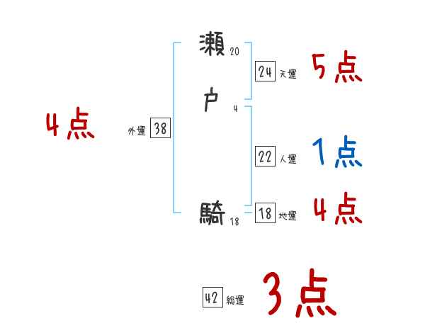 天運![]() | 瀬戸騎さんの天運は24画の5つ星!家庭運が良く順調な人生。金運にも恵まれる。 家系が持つ宿命的な運勢を表します。祖先から受け継いだ苗字ですので自分の力が及びません。家柄を象徴します。 |