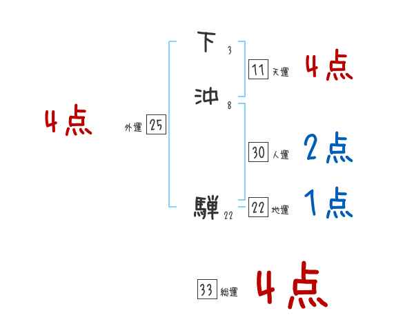 天運![]() | 下沖騨さんの天運は11画の4つ星!着実に富や地位を得る幸運な人生。 家系が持つ宿命的な運勢を表します。祖先から受け継いだ苗字ですので自分の力が及びません。家柄を象徴します。 |