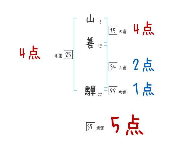 人運![]() | 山善騨さんの人運は34画の2つ星!独創性に優れるが、自尊心が強く災難に注意しましょう。 性格や才能などを表す2番目に重要な運勢です。人間関係や協調性、社会的な成功に影響します。主に20歳から50歳ぐらいまでの中年期の運勢を表します。 |
