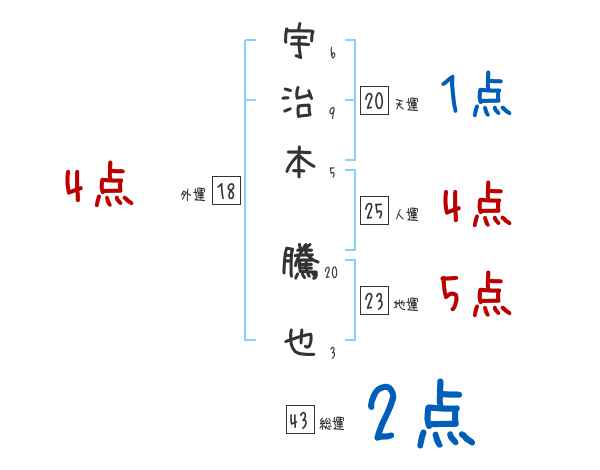 総運![]() | 宇治本騰也さんの総運は43画の2つ星!頑固な性格で独立心が強いかも。やや非現実的で浪費に注意しましょう。 あなたの人生を表す1番重要な運勢です。生涯を通じて影響する総合運となり、主に50歳以降の晩年期に影響を及ぼします。 |