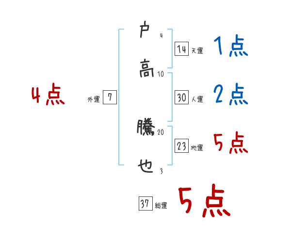外運![]() | 戸高騰也さんの外運は7画の4つ星!強い意志や信念を持ち独立心が強い。自立する。 生活面を象徴する運勢です。外部から受ける影響力を表し、結婚運、家庭運や職場、環境への順応性を表します。 |