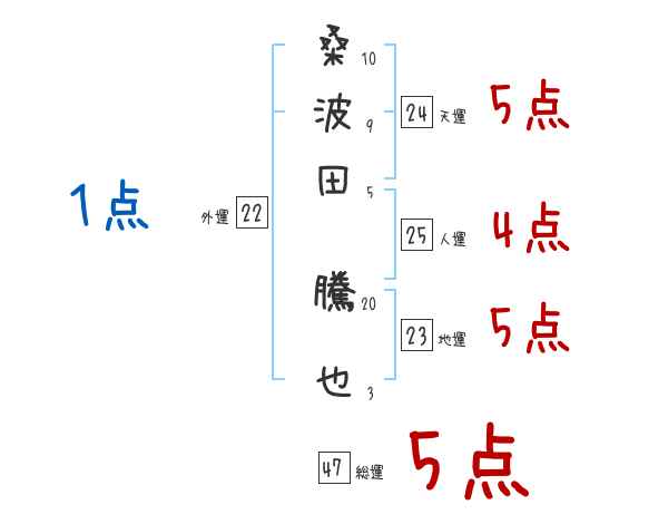 天運![]() | 桑波田騰也さんの天運は24画の5つ星!家庭運が良く順調な人生。金運にも恵まれる。 家系が持つ宿命的な運勢を表します。祖先から受け継いだ苗字ですので自分の力が及びません。家柄を象徴します。 |