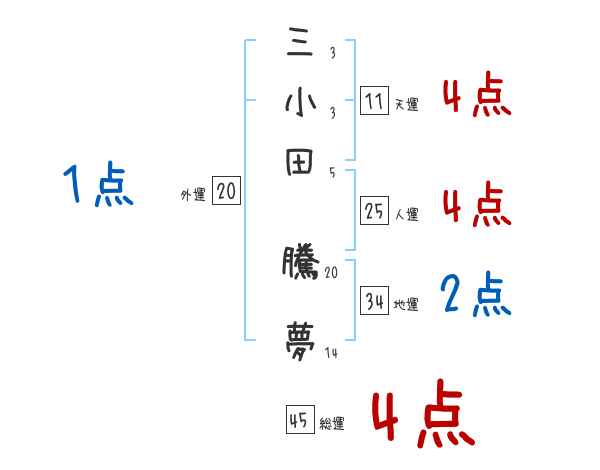天運![]() | 三小田騰夢さんの天運は11画の4つ星!着実に富や地位を得る幸運な人生。 家系が持つ宿命的な運勢を表します。祖先から受け継いだ苗字ですので自分の力が及びません。家柄を象徴します。 |