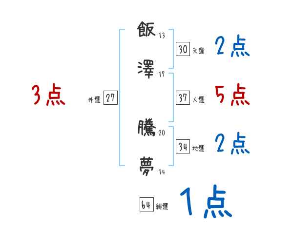 天運![]() | 飯澤騰夢さんの天運は30画の2つ星!浮き沈みの激しさに注意しましょう。 家系が持つ宿命的な運勢を表します。祖先から受け継いだ苗字ですので自分の力が及びません。家柄を象徴します。 |
