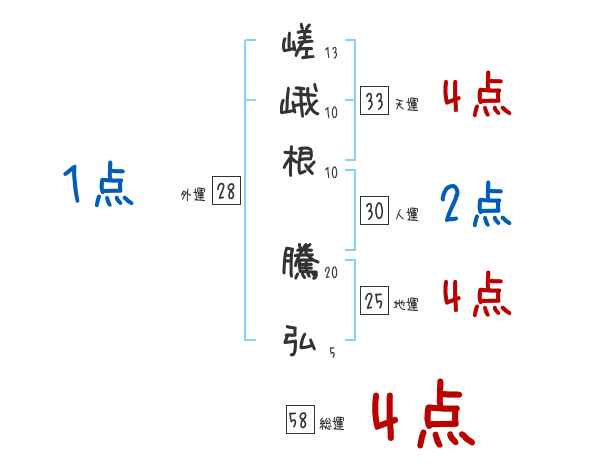 総運![]() | 嵯峨根騰弘さんの総運は58画の4つ星!安定した生活。大器晩成タイプ。 あなたの人生を表す1番重要な運勢です。生涯を通じて影響する総合運となり、主に50歳以降の晩年期に影響を及ぼします。 |