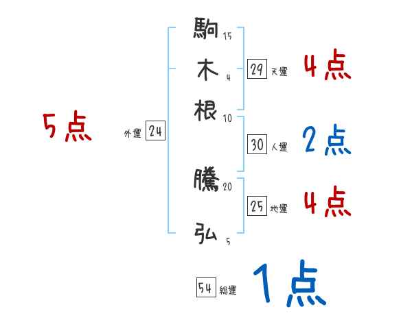 総運![]() | 駒木根騰弘さんの総運は54画の1つ星!トラブルが多いかも。周りをよく見て協調して過ごしましょう。 あなたの人生を表す1番重要な運勢です。生涯を通じて影響する総合運となり、主に50歳以降の晩年期に影響を及ぼします。 |