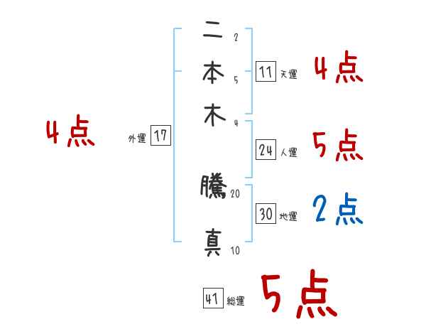 外運![]() | 二本木騰真さんの外運は17画の4つ星!積極的な行動力。地位を気づき財産を手に入れる。純粋な心と直感力。 生活面を象徴する運勢です。外部から受ける影響力を表し、結婚運、家庭運や職場、環境への順応性を表します。 |
