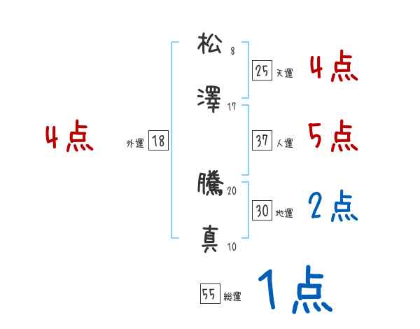 天運![]() | 松澤騰真さんの天運は25画の4つ星!個性があり才能があふれる。強運の持ち主で発展する。 家系が持つ宿命的な運勢を表します。祖先から受け継いだ苗字ですので自分の力が及びません。家柄を象徴します。 |