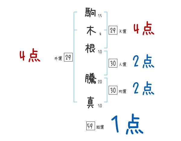 総運![]() | 駒木根騰真さんの総運は59画の1つ星!意志の弱さであきらめることが多いかも。粘り強さが必要。 あなたの人生を表す1番重要な運勢です。生涯を通じて影響する総合運となり、主に50歳以降の晩年期に影響を及ぼします。 |