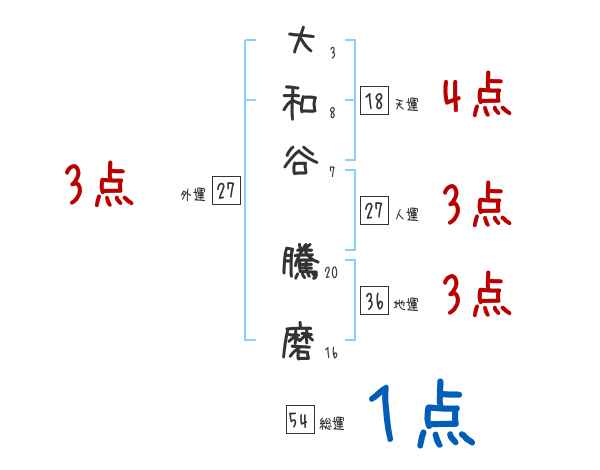 天運![]() | 大和谷騰磨さんの天運は18画の4つ星!情熱的で剛気。忍耐力があり信頼される。 家系が持つ宿命的な運勢を表します。祖先から受け継いだ苗字ですので自分の力が及びません。家柄を象徴します。 |