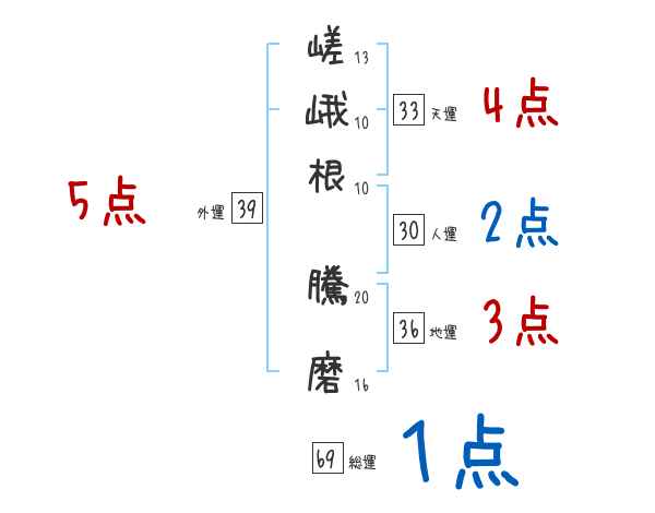 天運![]() | 嵯峨根騰磨さんの天運は33画の4つ星!権力志向でプライドが高い。勇気があり運を切り開き成功する。 家系が持つ宿命的な運勢を表します。祖先から受け継いだ苗字ですので自分の力が及びません。家柄を象徴します。 |