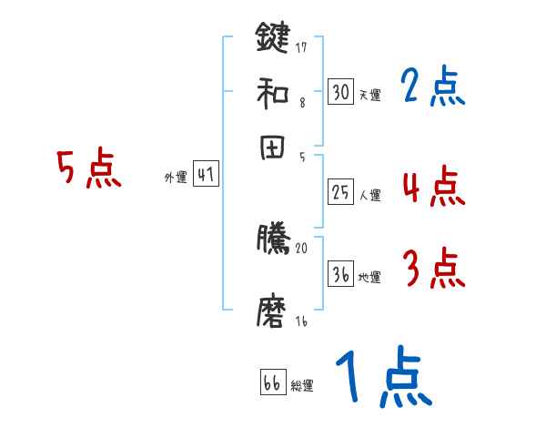 天運![]() | 鍵和田騰磨さんの天運は30画の2つ星!浮き沈みの激しさに注意しましょう。 家系が持つ宿命的な運勢を表します。祖先から受け継いだ苗字ですので自分の力が及びません。家柄を象徴します。 |