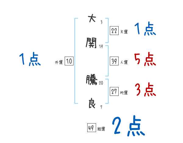 天運![]() | 大関騰良さんの天運は22画の1つ星!努力することが苦手ないっぽう手先が器用。芸術性にも優れる。 家系が持つ宿命的な運勢を表します。祖先から受け継いだ苗字ですので自分の力が及びません。家柄を象徴します。 |