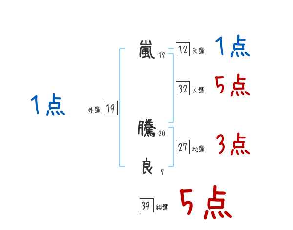 人運![]() | 嵐騰良さんの人運は32画の5つ星!柔軟性があり成功する。チャンスが多く金運が良い。 性格や才能などを表す2番目に重要な運勢です。人間関係や協調性、社会的な成功に影響します。主に20歳から50歳ぐらいまでの中年期の運勢を表します。 |
