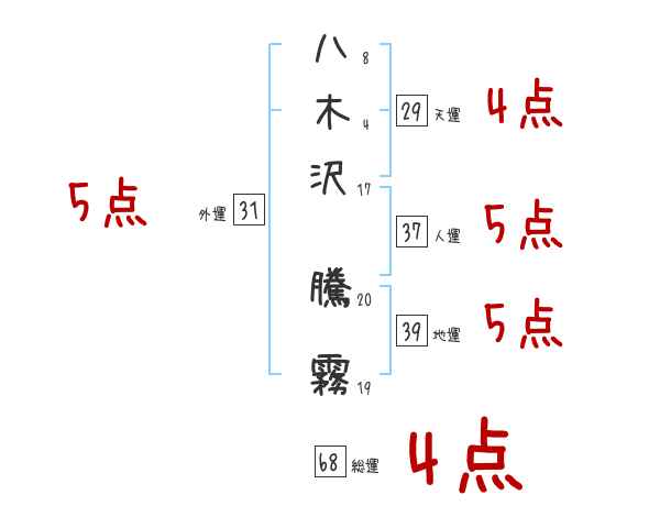 天運![]() | 八木沢騰霧さんの天運は29画の4つ星!完全主義で才能がある。厳格な心の持ち主。 家系が持つ宿命的な運勢を表します。祖先から受け継いだ苗字ですので自分の力が及びません。家柄を象徴します。 |