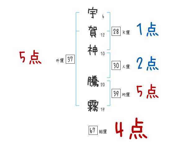 天運![]() | 宇賀神騰霧さんの天運は28画の1つ星!家庭環境に注意。スポーツで活躍できる能力があるかも。 家系が持つ宿命的な運勢を表します。祖先から受け継いだ苗字ですので自分の力が及びません。家柄を象徴します。 |