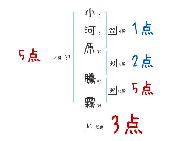 天運![]() | 小河原騰霧さんの天運は22画の1つ星!努力することが苦手ないっぽう手先が器用。芸術性にも優れる。 家系が持つ宿命的な運勢を表します。祖先から受け継いだ苗字ですので自分の力が及びません。家柄を象徴します。 |