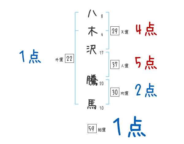 外運![]() | 八木沢騰馬さんの外運は22画の1つ星!努力することが苦手ないっぽう手先が器用。芸術性にも優れる。 生活面を象徴する運勢です。外部から受ける影響力を表し、結婚運、家庭運や職場、環境への順応性を表します。 |