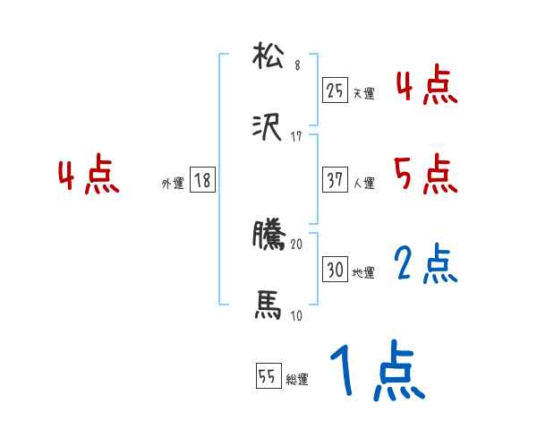 外運![]() | 松沢騰馬さんの外運は18画の4つ星!情熱的で剛気。忍耐力があり信頼される。 生活面を象徴する運勢です。外部から受ける影響力を表し、結婚運、家庭運や職場、環境への順応性を表します。 |