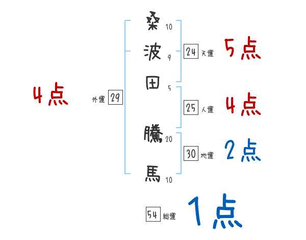 天運![]() | 桑波田騰馬さんの天運は24画の5つ星!家庭運が良く順調な人生。金運にも恵まれる。 家系が持つ宿命的な運勢を表します。祖先から受け継いだ苗字ですので自分の力が及びません。家柄を象徴します。 |