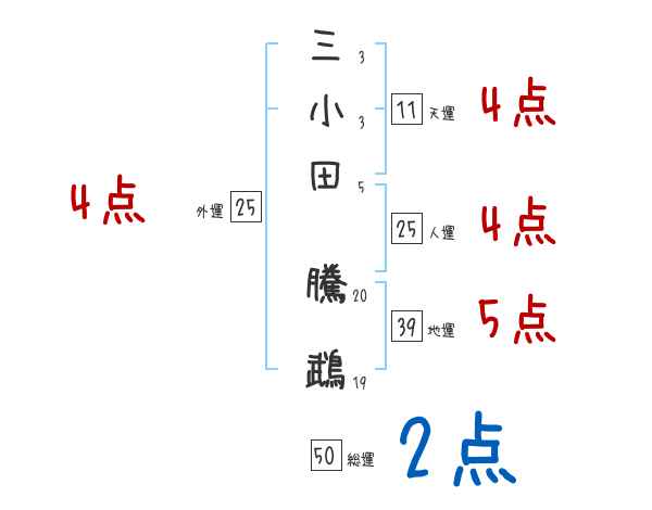 天運![]() | 三小田騰鵡さんの天運は11画の4つ星!着実に富や地位を得る幸運な人生。 家系が持つ宿命的な運勢を表します。祖先から受け継いだ苗字ですので自分の力が及びません。家柄を象徴します。 |